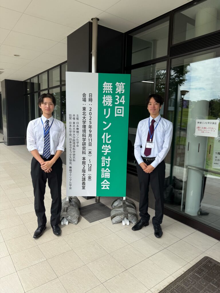 日本無機リン化学会 第34回無機リン化学討論会仙台大会 未分類 2025.09.18 2025.09.11-12,東北大学青葉山キャンパスにおいて,第34回無機リン化学討論会仙台大会に橋本研究室の修士2年の2名の学生が口頭発表を行いました。